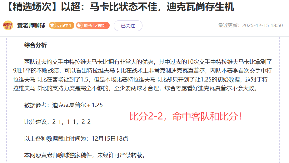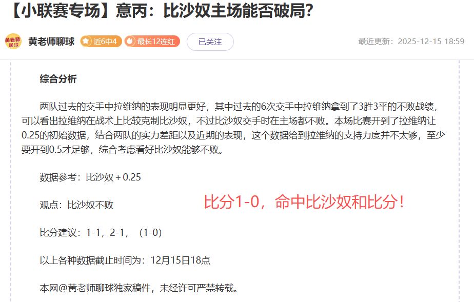 黄老师致力于研究各大赛事数据,每场都是精心挑选,适合长期关注,保持一个好心态,我们一起共同进步!以下解锁内容包含:综合分析+观点方向+比分预测