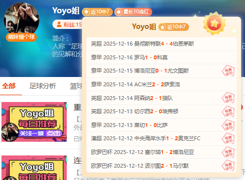 【上期回顾】:昨天私推暂停,而公推意甲遭遇遗憾,但近15胜11表现不错!另外超级重点英超方案红魔战平,但近5胜4依然棒棒哒!——今天核心赛事已确认,信心依旧,各位可点击一下【赞赏】按钮给予鼓励,轻松在“站内信”获取当天新鲜信心专场哦!多一份参考离喜悦再近一步,Yoyo将继续率粉粉们继续前行~